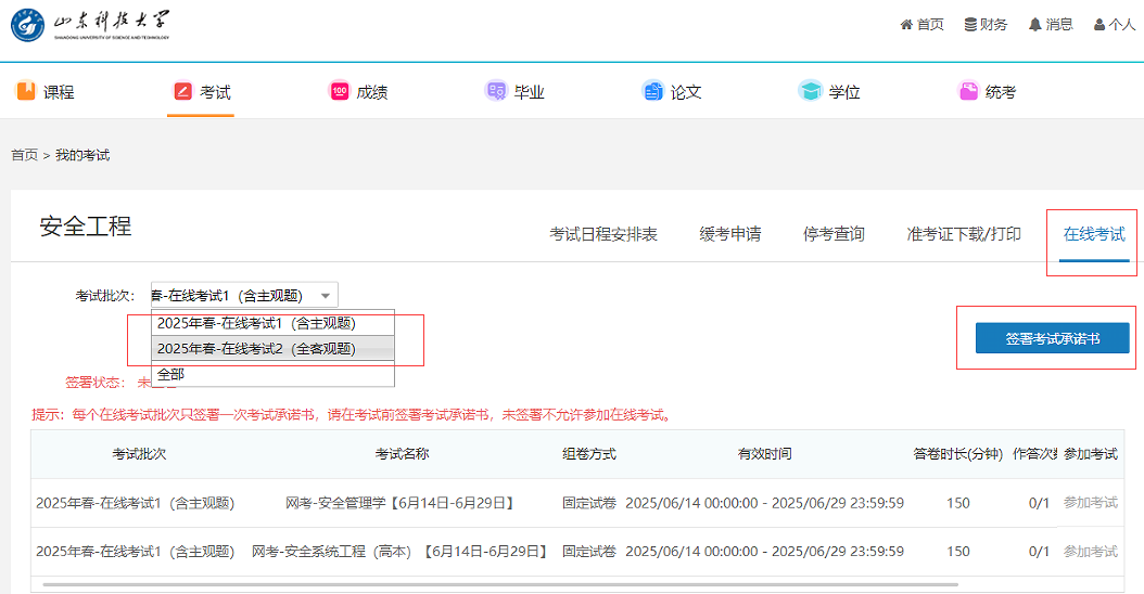 在该页面点击批次,在批次下拉列表中会显示“2025年春-在线考试1(含主观题)”和“2025年春-在线考试2(全客观题)”,核实各批次下考试科目后,点击开始答题,即可参加线上考试。
