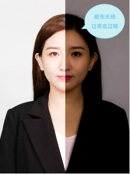 3、露出耳朵和额头,头部正视镜头,保持肩膀齐平,表情自然,嘴唇自然闭合。