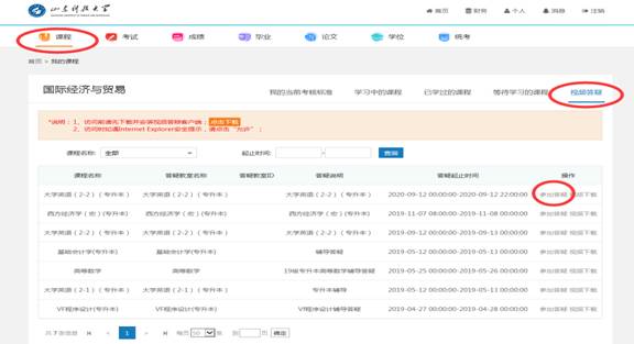 学生可从“通知公告”栏中查看本学期辅导答疑授课安排表,或者直接从“课程”标签进入视频答疑,根据答疑起止时间,当“参加答疑”为蓝色可用时,即可点击进入答疑教室,参加视频答疑。非答疑时间,“参加答疑”按钮为灰色。